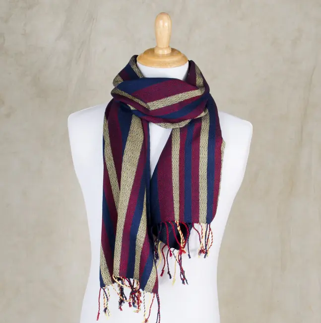 The bar scarf — alternating horizontal stripes in two primary club colours — is the dominant format in licensed sports merchandise globally. WeaveEssence’s standard bar scarf specification can be produced from 300 units and is compatible with most licensor approval processes without design deviation requirements.